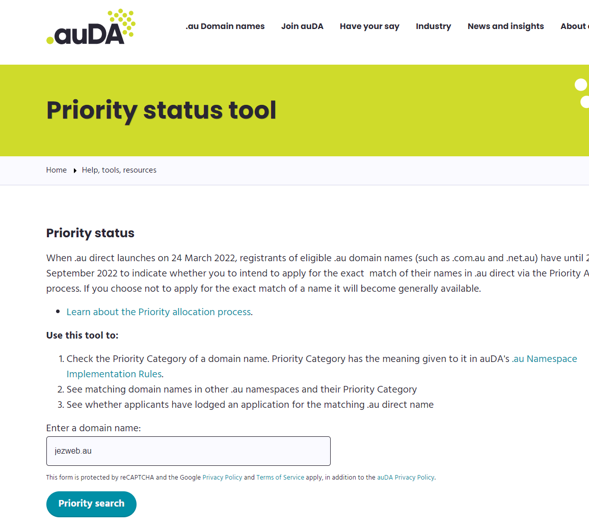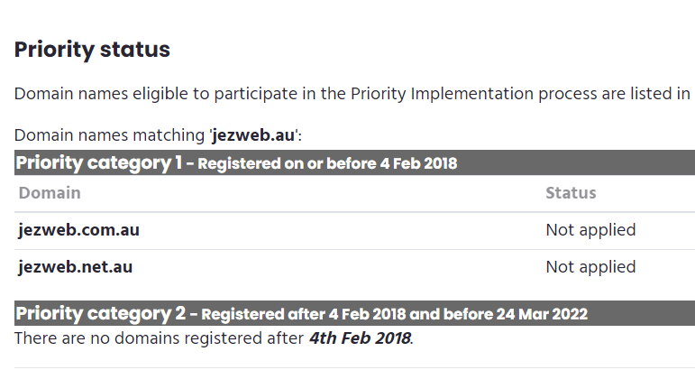 If you already hold a .au name in another namespace e.g. com.au, org.au. etc. you will have six months from 24 March until 20 September 2022 to apply for its exact .au direct match. The six-month period is known as the Priority Application Period.