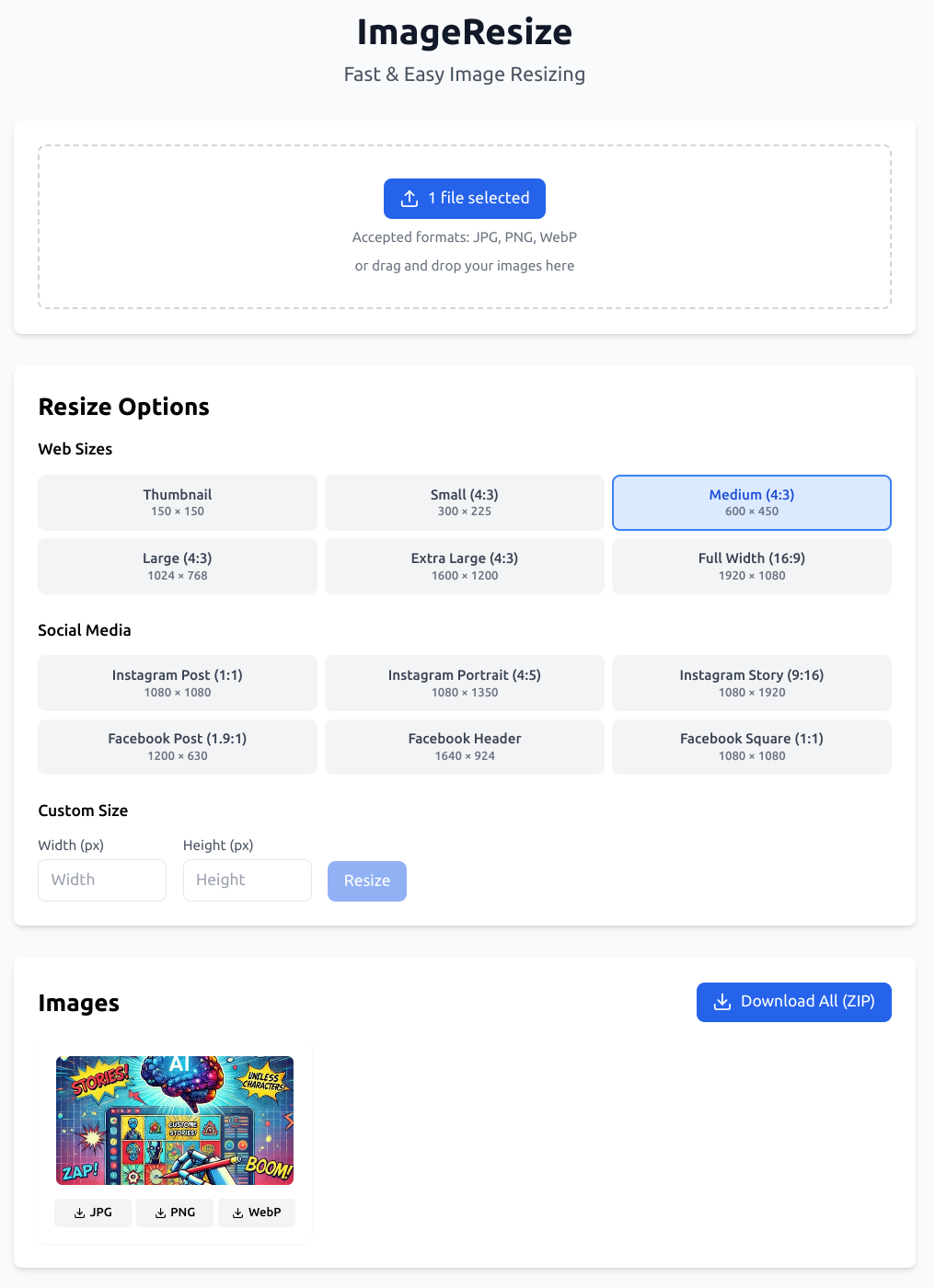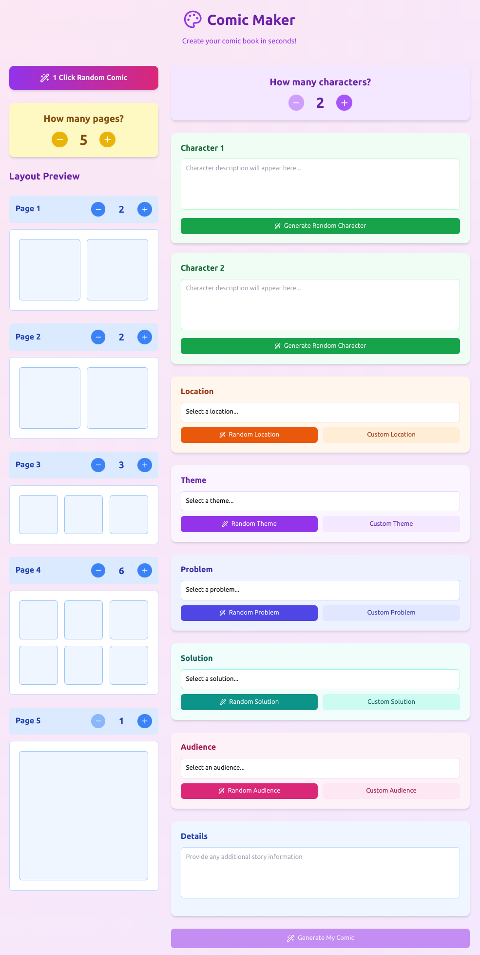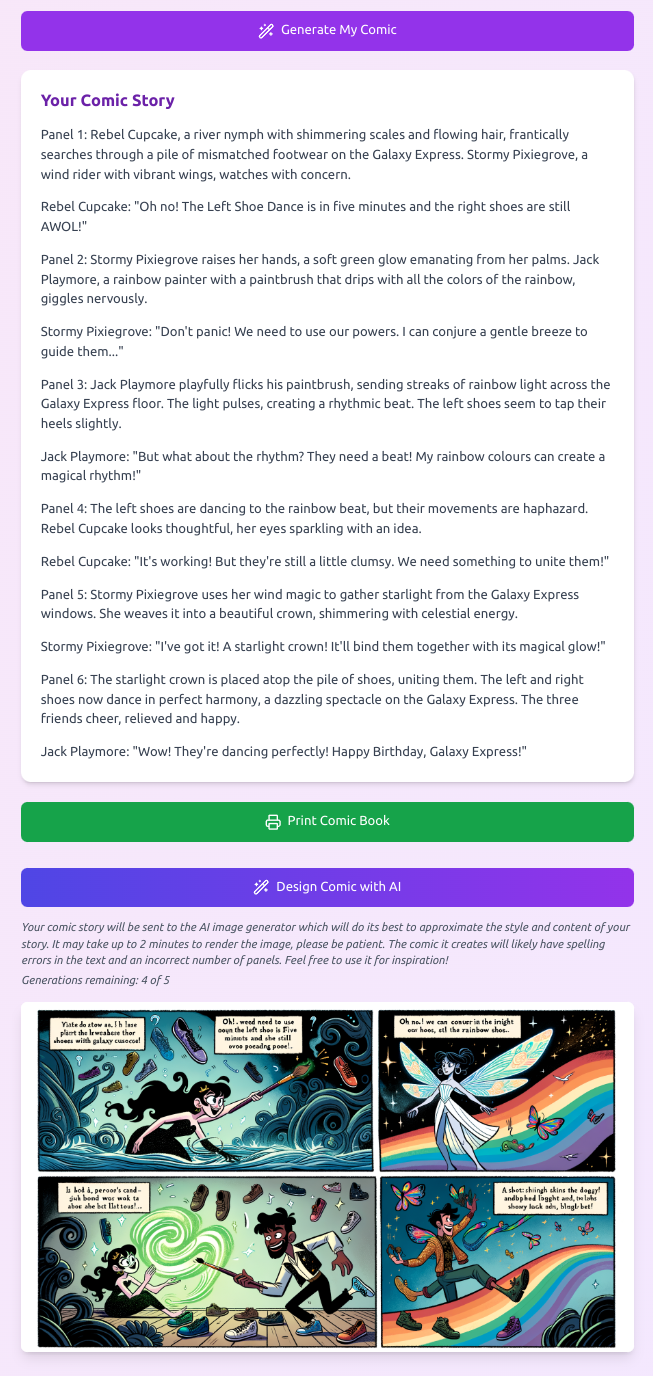 The screenshot below is the result of many iterations and enhancements. What started as a box to type in your story idea became a whole framework of pages, panels, characters, location, theme, problem, solution and audience inputs. All of those details are bundled into a prompt for the AI to create the comic story with dialogue for each panel.