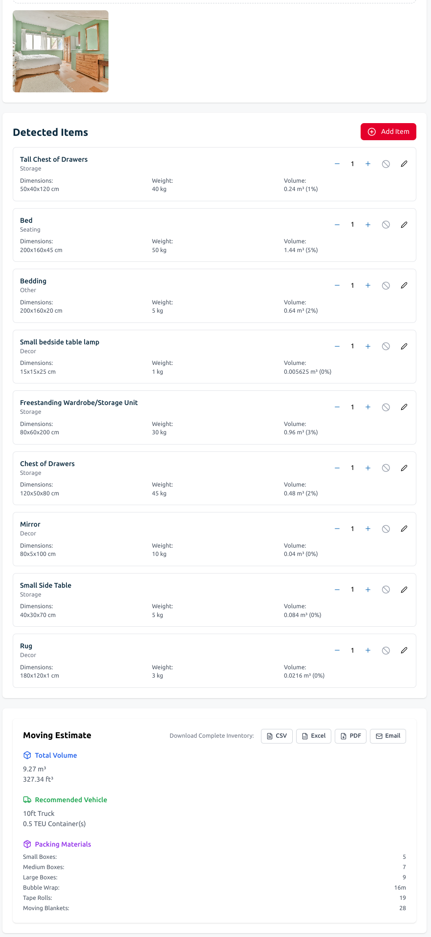 I've created a working example of how AI can transform photos into an inventory to help provide a tangible look at what is possible. It’s not as accurate as a tape measure but if the photos are well proportioned and good quality it works pretty well. Definitely a lot faster than manually itemising and measureing everything!