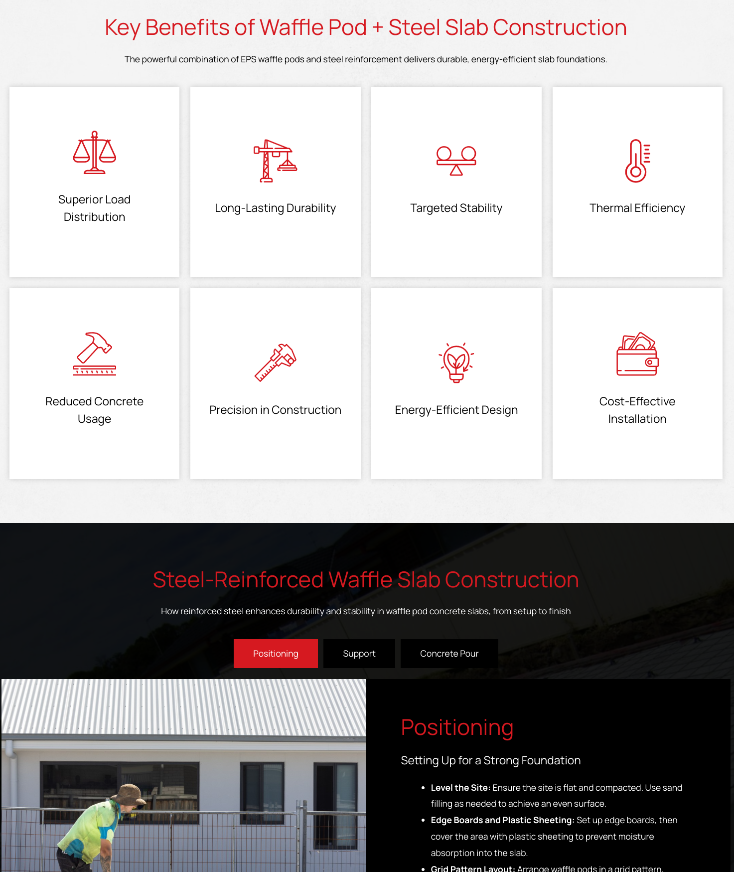 We had a great selection of photos to work with, along with a drone video of a slab pour for the hero section on the homepage. Strong contrast and colours are carried from the branding through to the headings, graphics, and navigation elements. |