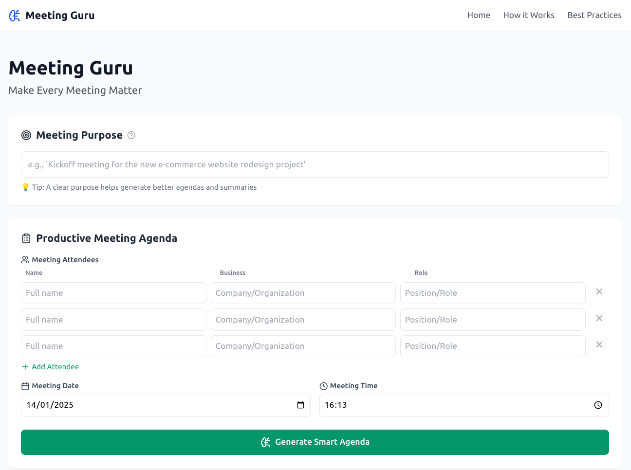 Our AI analyses your input to generate agendas, summaries, scope definitions, and deliverables. Define Your Meeting Purpose Start by clearly stating your meeting's purpose. This helps our AI understand the context and generate more relevant content. Add Context Upload meeting transcripts, notes, and relevant documents to provide additional context for better results. Generate Insights Our AI analyzes your input to generate agendas, summaries, scope definitions, and deliverables lists.