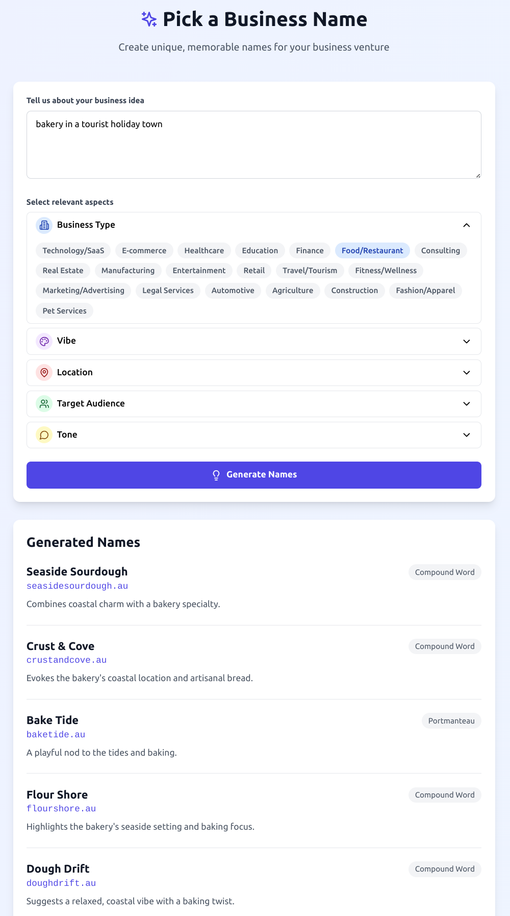 Enter some details about the business, click a few of the categories and get a set of business name ideas. It’s simplistic but better than staring at a blank page waiting to be inspired with a new business or website name. |