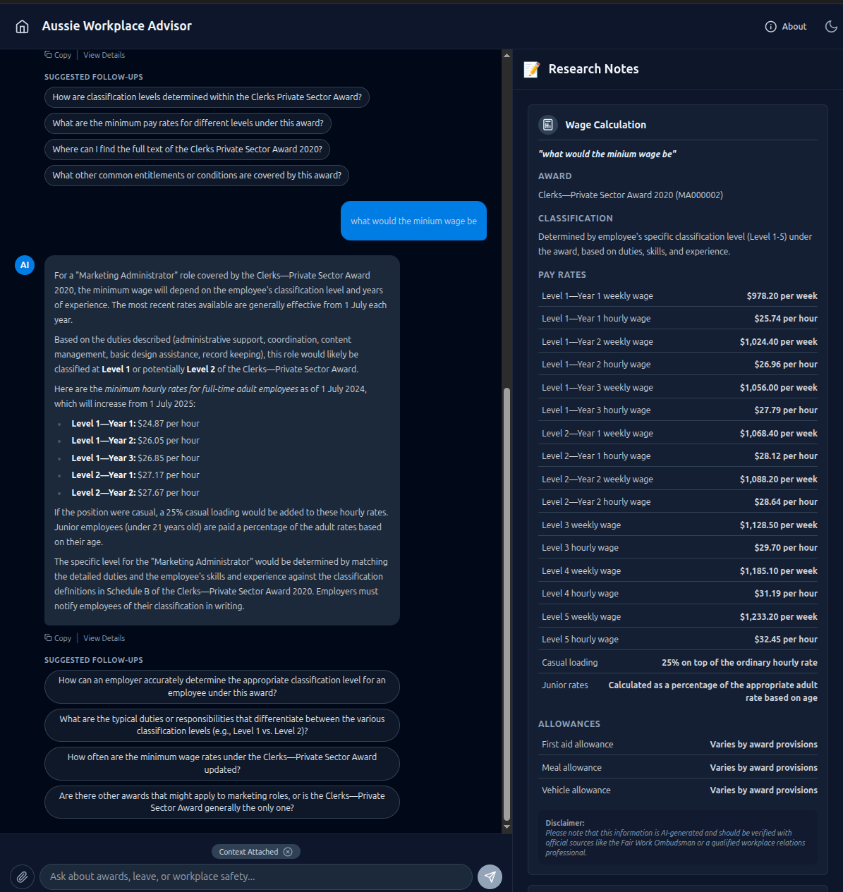 I gave it the same job ad for a graphic designer that broke the Fair Work bot. My tool not only identified the correct award (the Graphic Arts, Printing and Publishing Award) but also created a detailed summary of the key entitlements.
