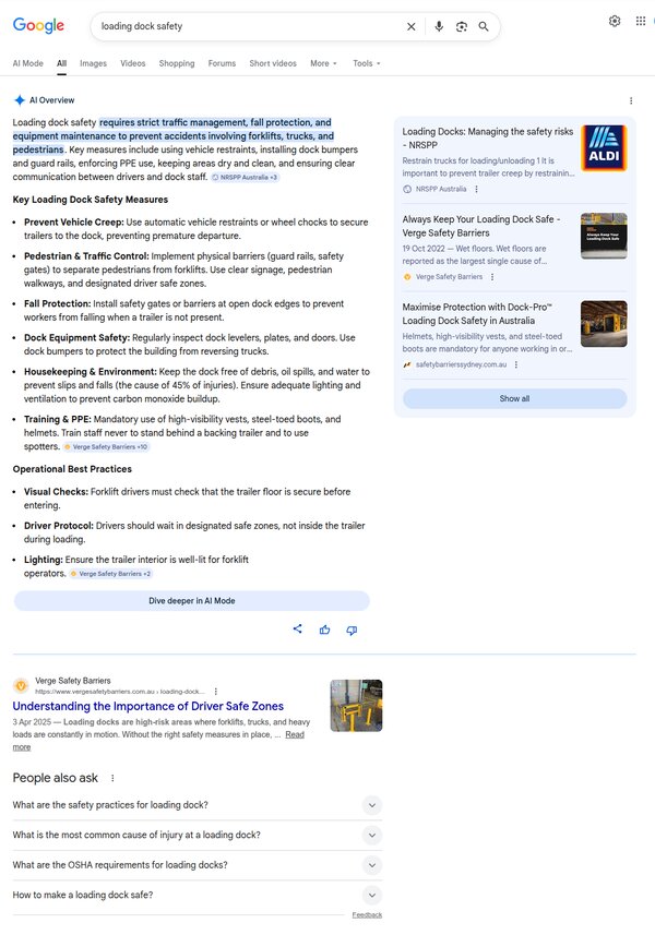 That content is exactly what Google's AI is looking for. When it writes a summary about loading dock safety, it pulls from pages that actually say something. Verge shows up because their site gives the AI real substance to work with. Businesses with a homepage that says "we provide quality solutions" don't.