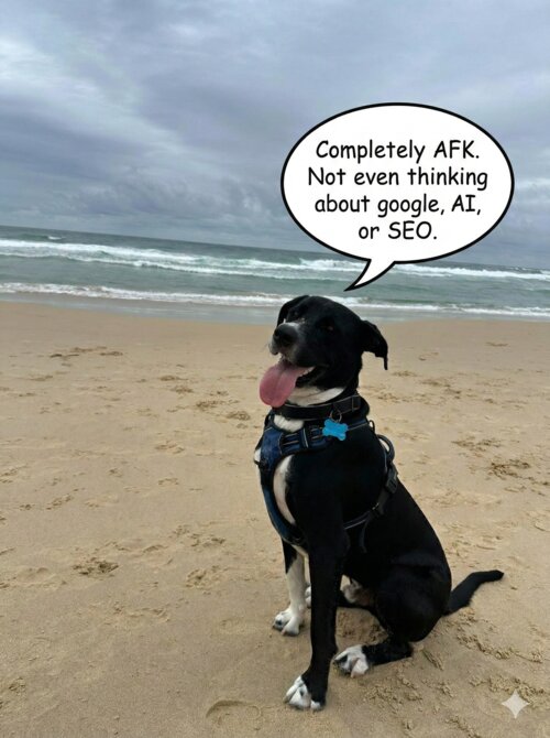 Away from the keyboard: Caves Beach with Panda. He has zero opinions about Google's AI Overview, and honestly that's the energy I needed.