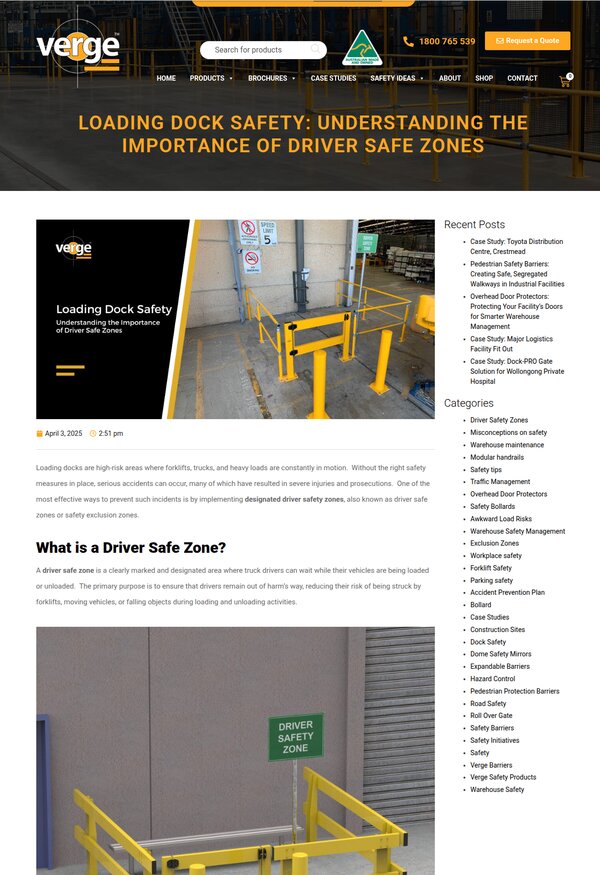 That's Verge Safety Barriers. We've worked with them for a while, and one of the things we focused on was building out detailed content pages for every area of their expertise. Loading dock safety. Driver safe zones. Warehouse hazard reduction. Not vague marketing copy. Specific, useful information about real problems their customers face.